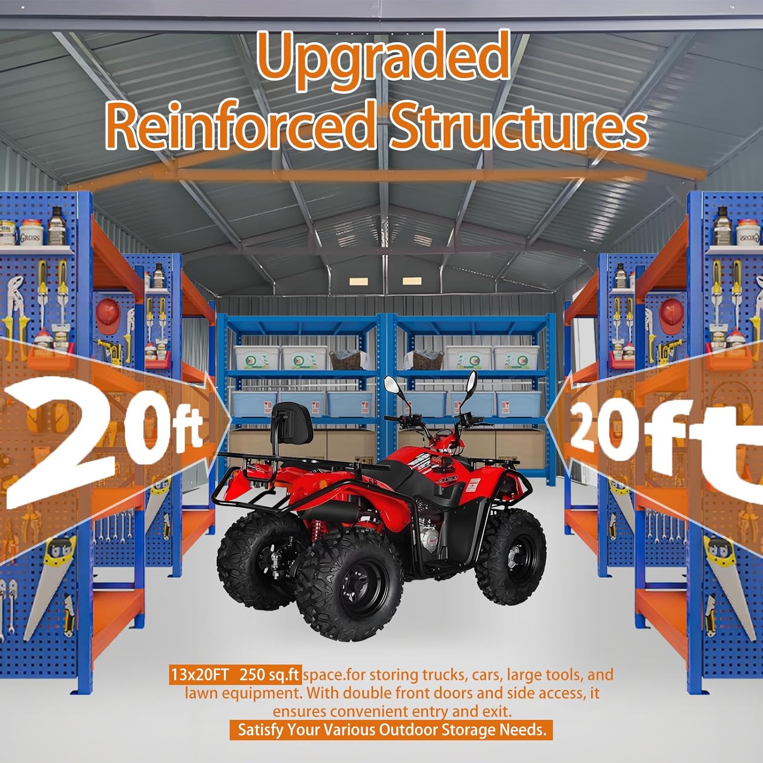 - Outdoor Storage Shed for Maximum Space Utilization: Our outdoor storage shed, featuring a generous 250 square feet of floor space, metal shed heavy duty reinforced metal frame with 20lbs/sqft Snow Load capacity and 50M/ph Wind Resistance, ideal for trucks, cars, large tools, and lawn equipment, it ensures you never run out of storage again