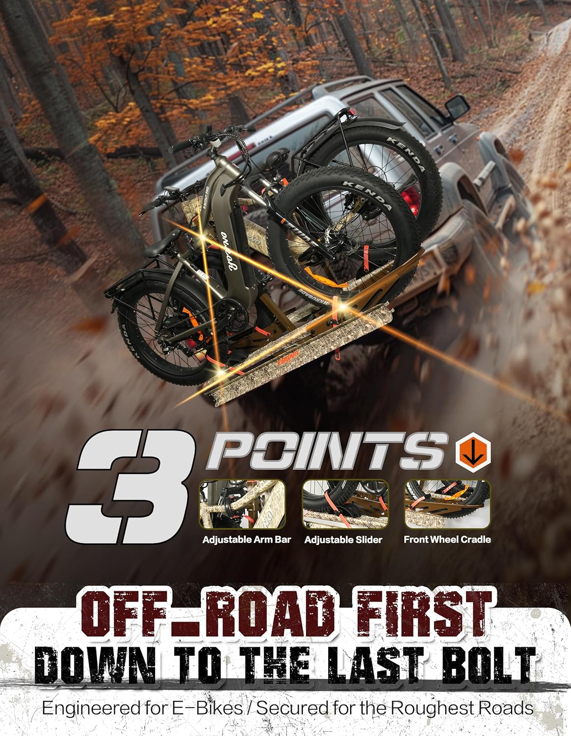 • Heavy-Duty Platform, Built for E-Bikes & Fat Tires:Carry up to 2 e-bikes, fat tire bikes, or standard bicycles—each up to 100lbs. Our heavy-duty steel frame and ultra-wide cradles accommodate tires up to 5" wide and wheelbases up to 50", making it the go-to solution for electric bike rack, fat tire bike rack, and cargo bike rack needs. Adjustable arms and sliders guarantee a secure fit for road, mountain, and hybrid bikes.