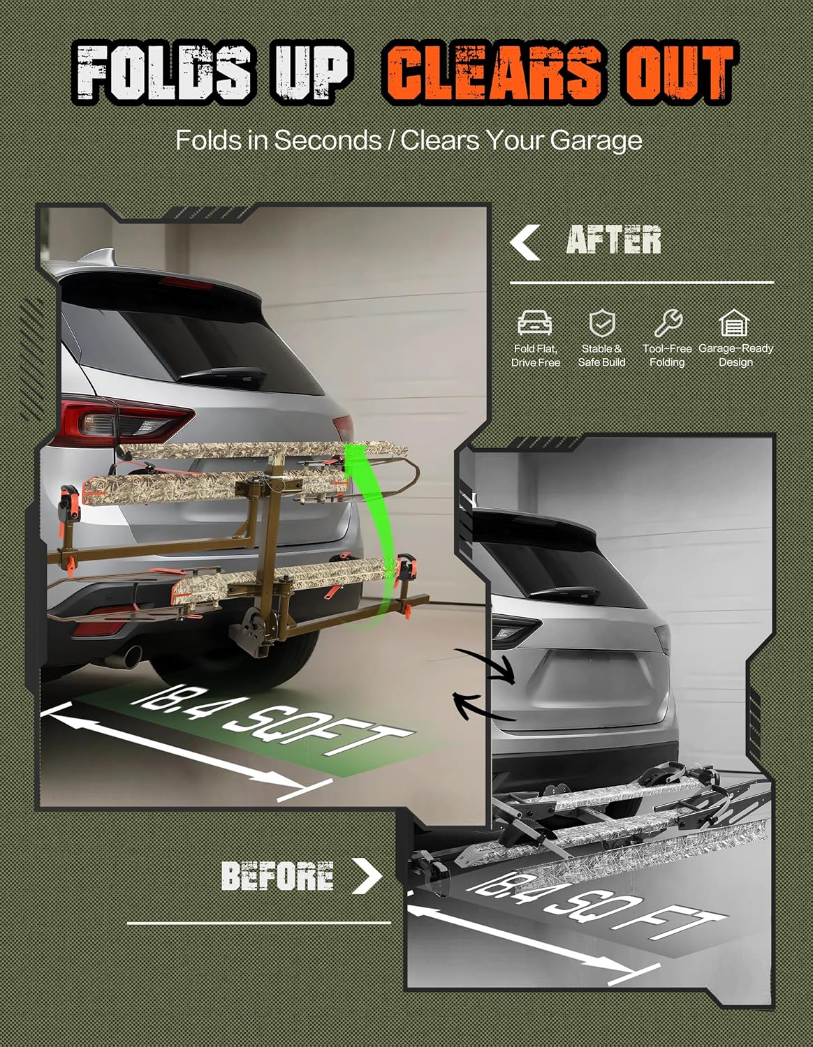 • Effortless Loading & Space-Saving Foldability: Roll bikes on and off with the built-in ramp—no heavy lifting required. The quick-release, foldable frame saves precious garage space and folds flat in seconds. Tool-free installation gets you on the road fast, while the low-profile design keeps your vehicle looking sharp, even when the rack is stored.
