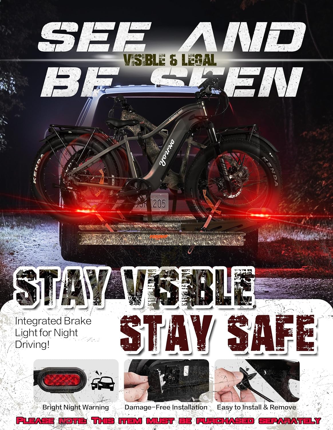 • Off-Road Tested Stability & Safety:This rack features a 3-point locking system, reinforced hitch mount, and anti-wobble tech for maximum security, even on rough terrain. Whether you’re using it as a trailer hitch bike rack, rv bike rack, or bike rack for heavy e-bike, your bikes stay safe—no rattling, no contact, no worries. FMVSS108-compatible brake light (sold separately) ensures legal, visible night driving.