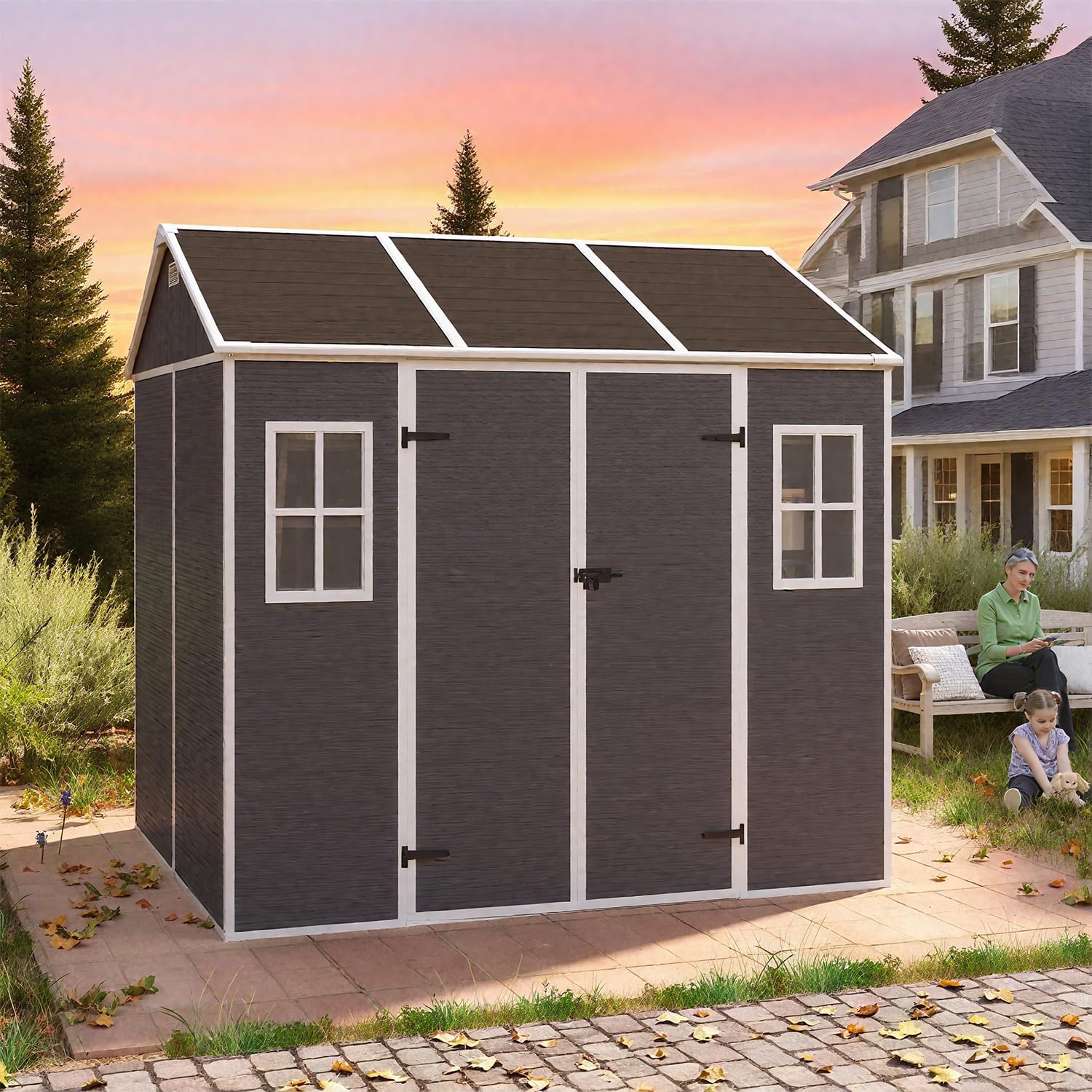 - đ ăAll-Weather Resin DurabilityăCrafted from high-quality plastic resin, this resin shed is built to handle rain, snow, and sunlight with ease. The waterproof and UV-resistant exterior helps protect your stored items all year long, while the reinforced double-wall panels add strength and thermal stability for lasting outdoor performance