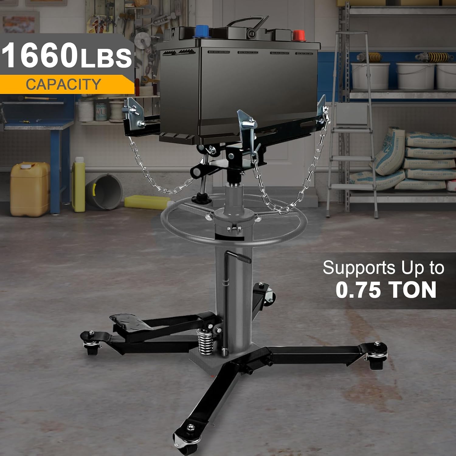 - Load rating: 1660 lbs (0.75 tons); Lowered height: 34 inch, Raised height: 70 inch (+/- 2 inch). Adjustable lift height range from 34 inch to 70 inch, perfect for mounting or removing any car or light truck transmission