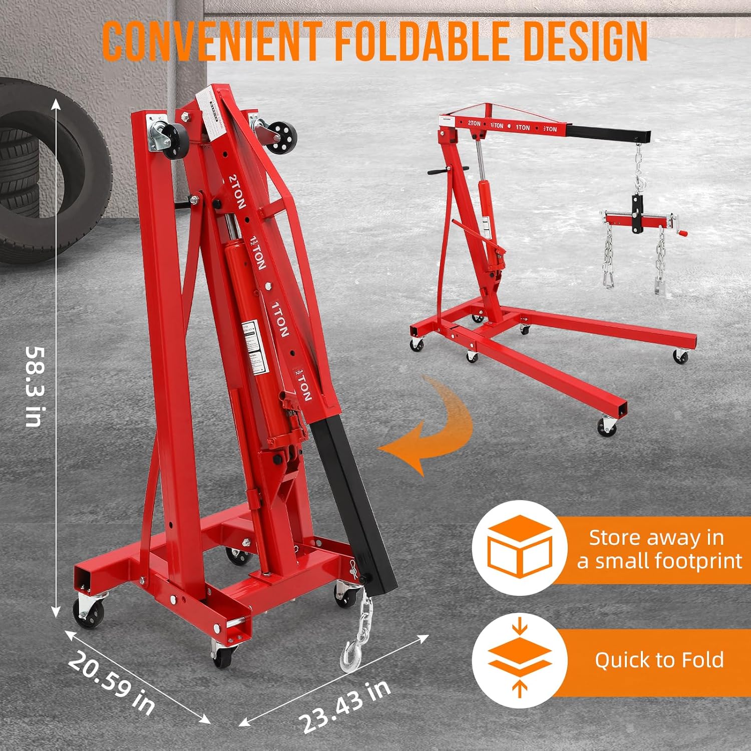 - 【EASY TO OPERATE】: Equipped with 6 smooth-rolling casters, Our hydraulic engine lifter is easy and flexible to move, Reducing manual labor and ensuring a stress-free repair experience. There are 4 adjustable positions ((0.5T, 1T, 1.5T, AND 2T) ) to meet your varying work requirements.