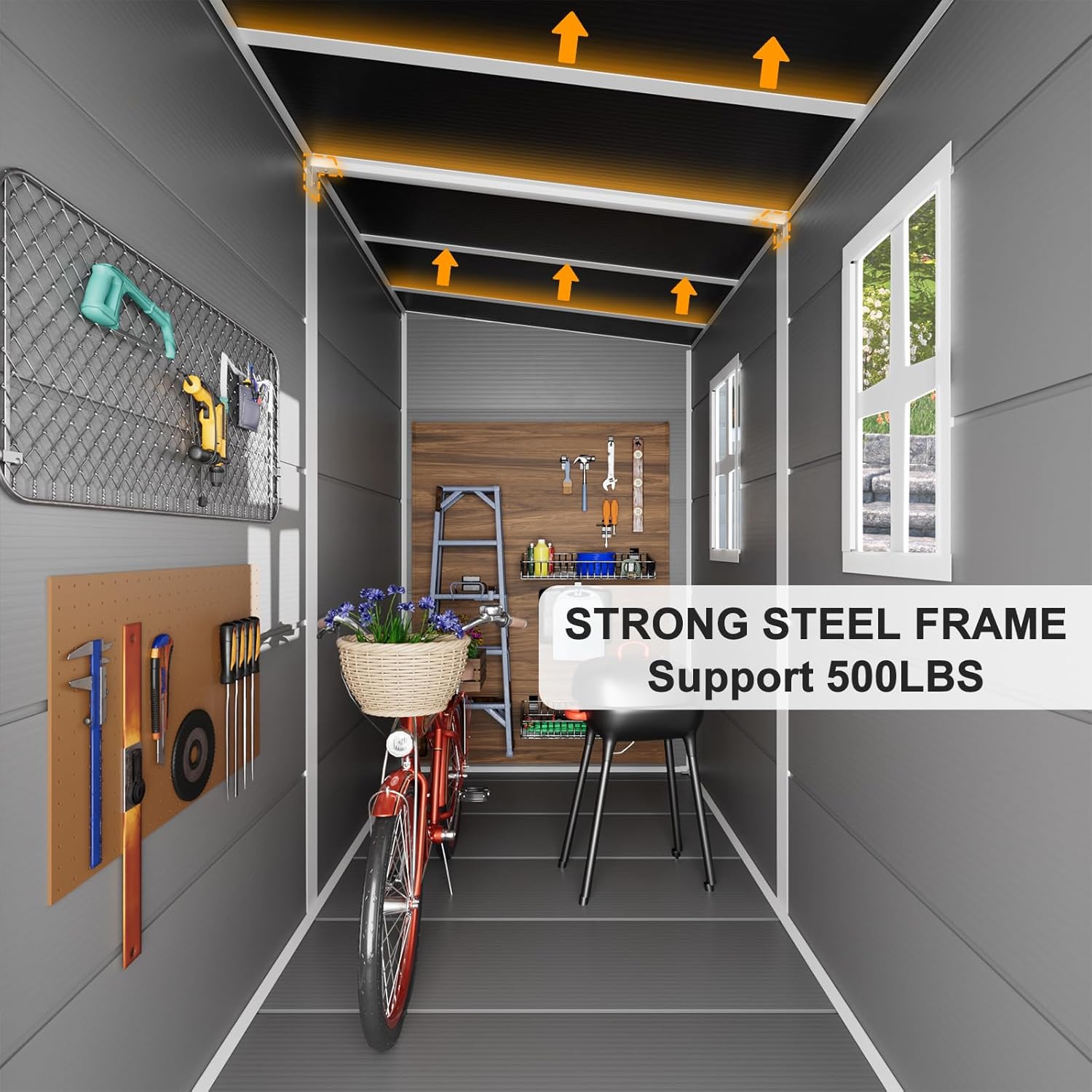 - Floor &Windows Inlcuded : The extra-wide front double doors for greater flexibility in organizing and accessing items, included shed floor,built-in ventilation prevents mold and mildew growth, enhanced safety for tools and equipment with lockable doors, Included D-Clip wall anchors to support shelves & hangers