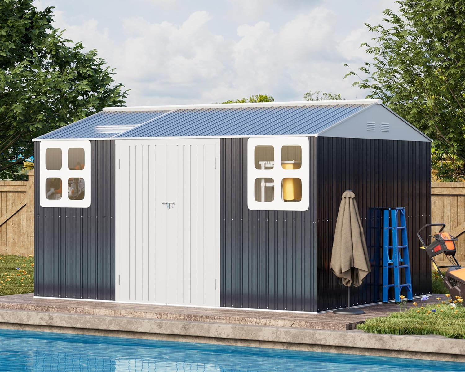 12x10 FT Metal Shed Heavy-Duty, Outdoor Storage Garden Sheds with Reinforced Steel Frame & Customizable Skylight, Weatherproof Galvanized Tool Tiny House for Backyard, Patio, and Lawn