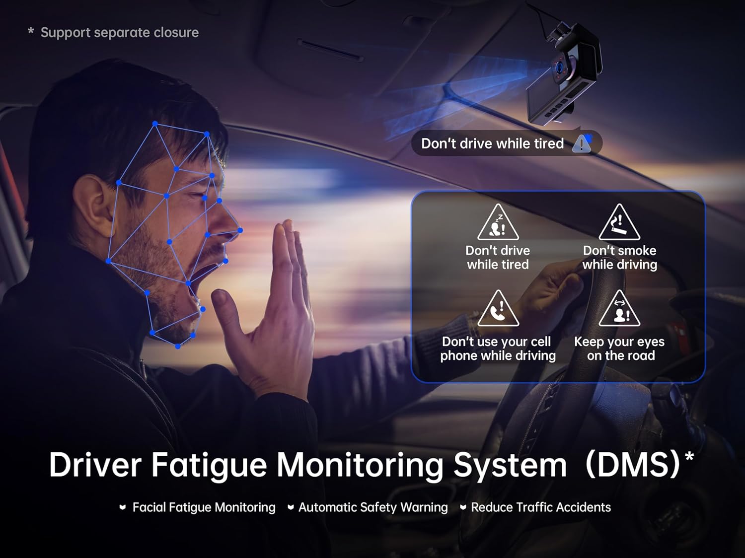 - [Driver Monitoring System-DMS] Pelsee dashcams for cars comes with an enhanced Driver Monitoring System (DMS),keeping a vigilant eye on the driver's condition, intelligently detects and alerts the driver to potential risks such as fatigue (yawning,eye closure), distraction (calling, smoking or looking away), It proactively issues voice alerts to keep you focused and safe on the road.Suitable for truckers,van operators, bus/Uber drivers, and solo travelers or families embarking on long journey