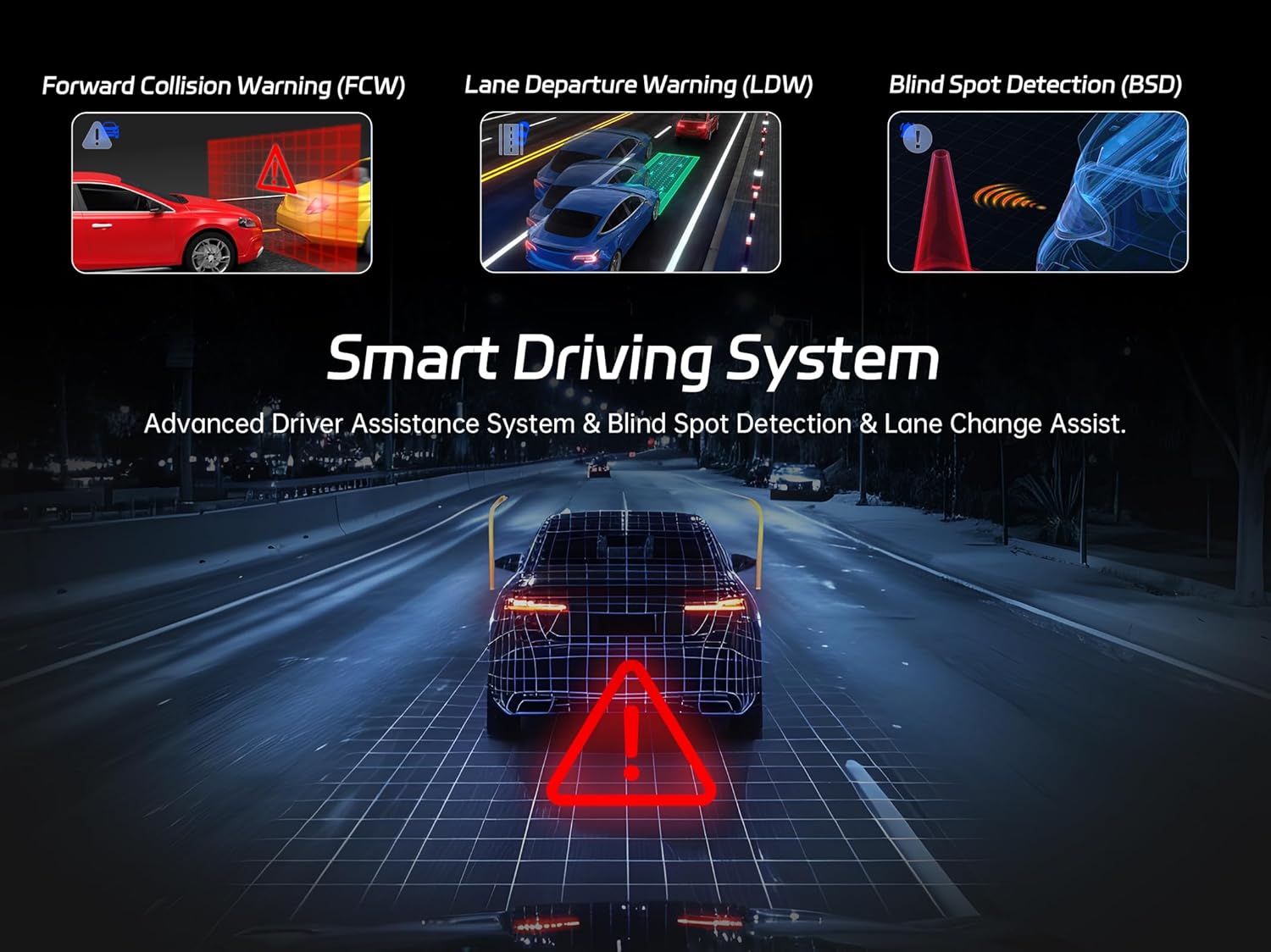 - [Smart Driving Assistance System] This car dash camera built in ADAS(Advanced Driver Assistance Systems), BSD(Blind Spot Detection), and LCA(Lane Change Assist), improve driving safety by alerting you to front collisions, maintaining safe distances, detecting pedestrians, notifying when the front vehicle moves, warning of lane departures, and identifying vehicles in blind spots or overtaking from the sides,which keeps you and your loved ones secure on every drive