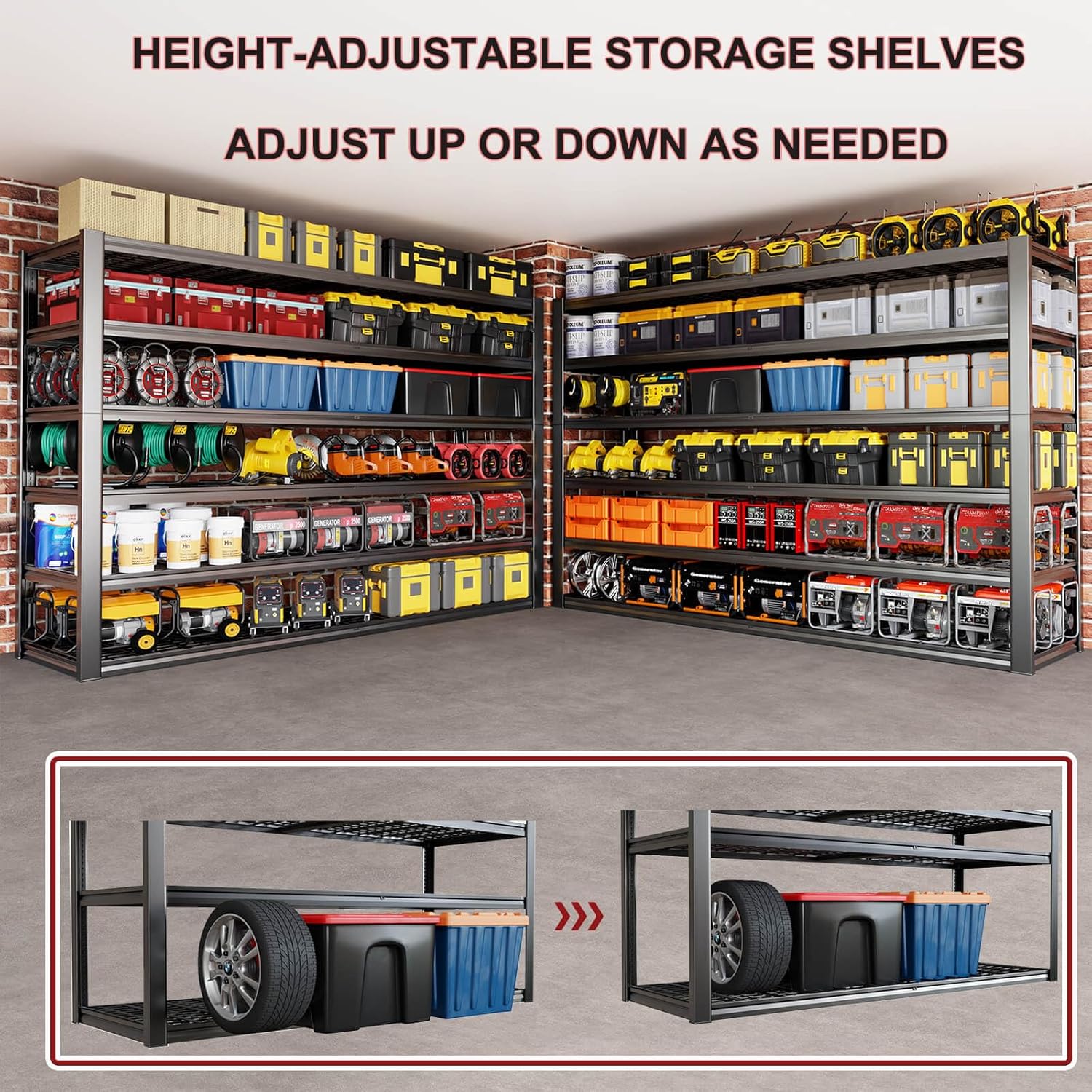 - ăAdjustable Heavy Duty Metal Shelves to Meet Different NeedsăThe height of each tier can be adjusted not only by moving the crossbar to meet the needs of different heights, but also the shelves can be assembled or disassembled into a variety of different metal shelves. The 84-inch tall 3900 lb. load-bearing garage shelves are not only strong, but they also give you more storage space.
