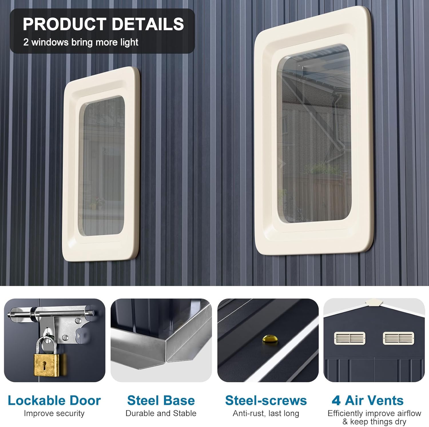 - Premium Durability & All-Weather: The metal storage shed is made from 0.25mm color steel plate & 0.6mm galvanized sheet. Includes reinforcement and 4 inland anchors, ensuring a solid overall structure capable of effectively resisting corrosion, oxidation, rain, and ultraviolet radiation. Lightweight and maintenance a breeze.