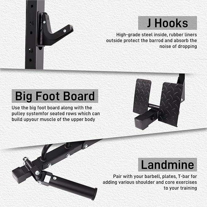 - Robust Build for Heavy Duty Use: Crafted with premium materials, this 2000LBS Power Cage Squat Rack ensures durability and stability during your garage workouts, allowing you to push your limits safely.