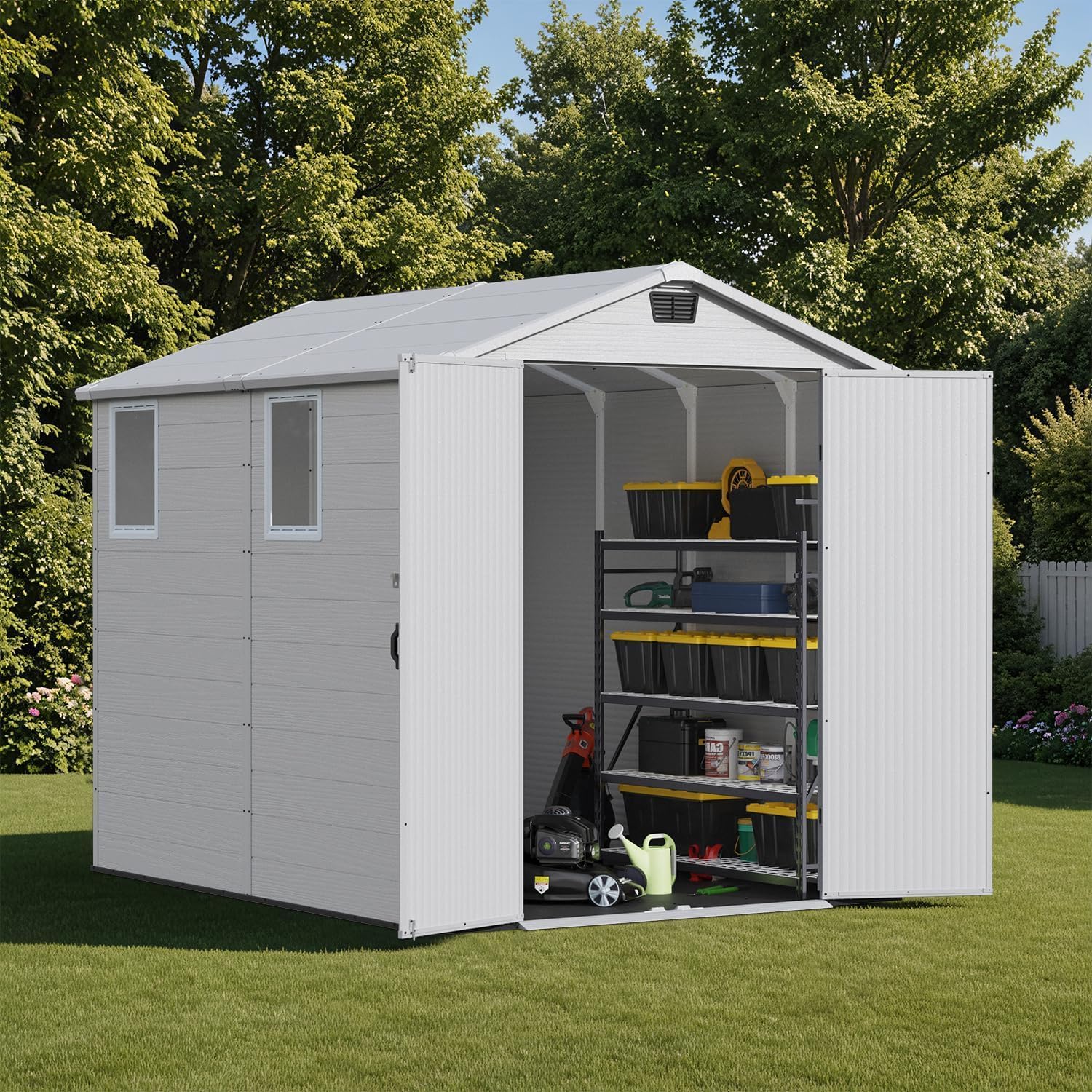 - Spacious 6x8 FT Outdoor Storage Shed: This extra-large resin shed (72.6"L×95"W×83"H) delivers massive storage capacity for all your outdoor needs. The roomy interior easily fits lawn mowers, bikes, and bulkier items with space to spare.