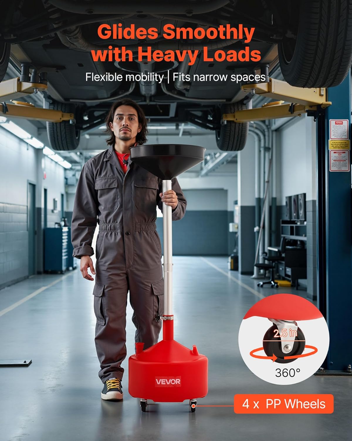 - Easy Mobility: Four-wheel drive with 2.5-inch swivel wheels of the portable oil drainer ensures smooth transport in complex environments like auto repair shops or personal garages