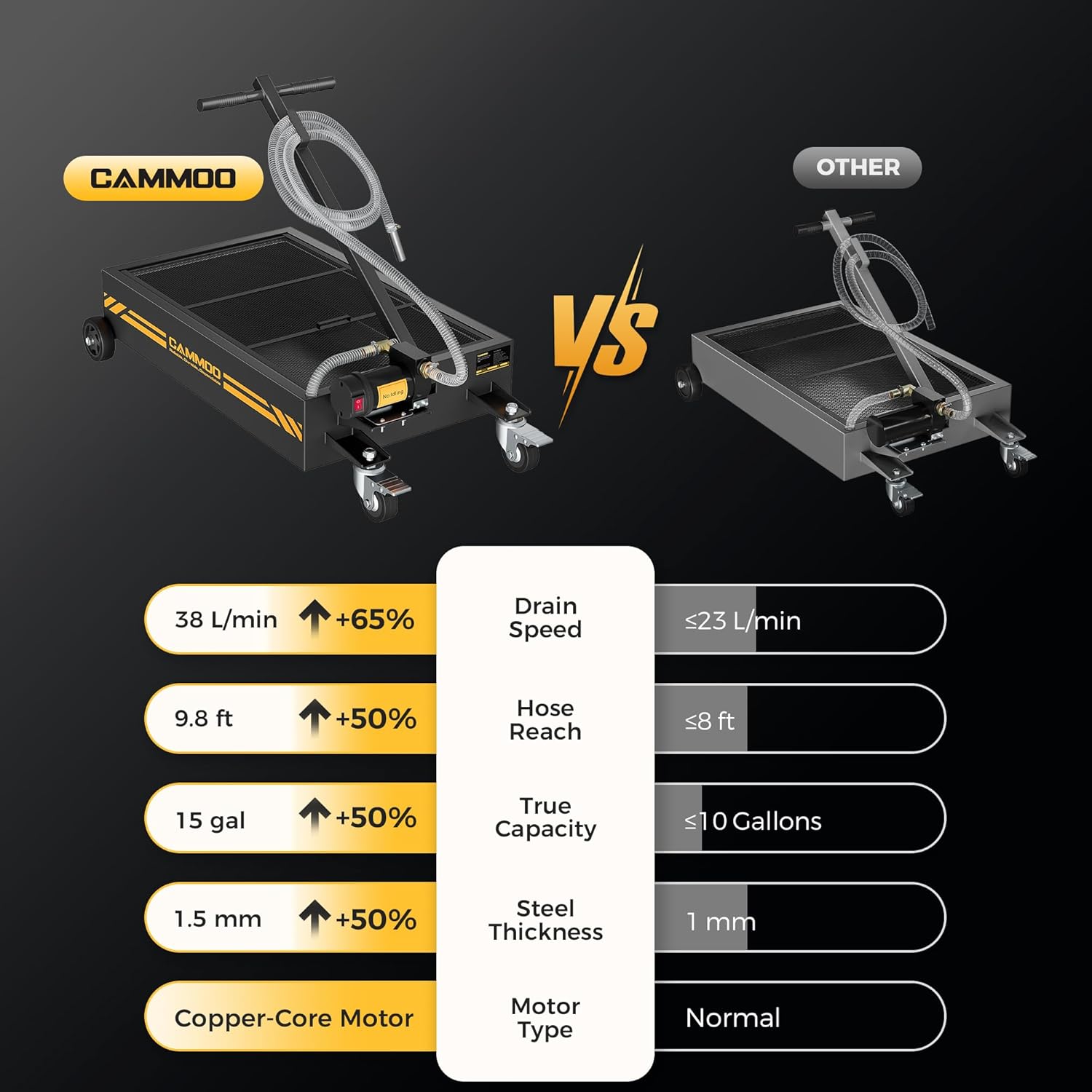 • Optimized Copper Motor:The copper motor features a 110V power supply and 200W maximum output, tipping the scales at 610.5g to stand heavier and more robust than standard motors in oil pans. This added heft translates to stronger performance: it delivers a powerful 38L/min flow rate, draining oil 65% faster to help finish jobs in less time. For busy shops, and weekend DIYers alike, this means boosted efficiency, reduced labor time, and smoother workflow—whether tackling back-to-back oil changes with oil pans or squeezing in a project at home. It is engineered to make every task quicker, easier, and more reliable.