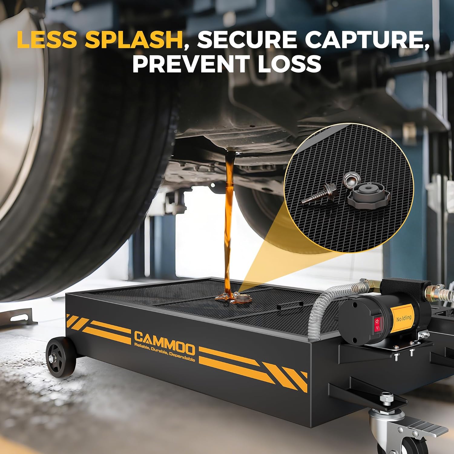 • Heavy-Duty Construction:The electric oil change pan has 1.5 mm carbon-steel walls and is 0.5 mm thicker than standard oil change pans, so it resists daily wear, handles heavy hydraulic loads without warping, and stands up to rough movement in busy shops. It features a precision powder-coat finish that fights corrosion, stays rust-free, and keeps the surface looking sharp. Finely welded seams boost load capacity and eliminate leak risks, and each unit is water-tested before shipment to ensure it is a long-lasting, leak-proof tool for shops, fleets, and DIYers.