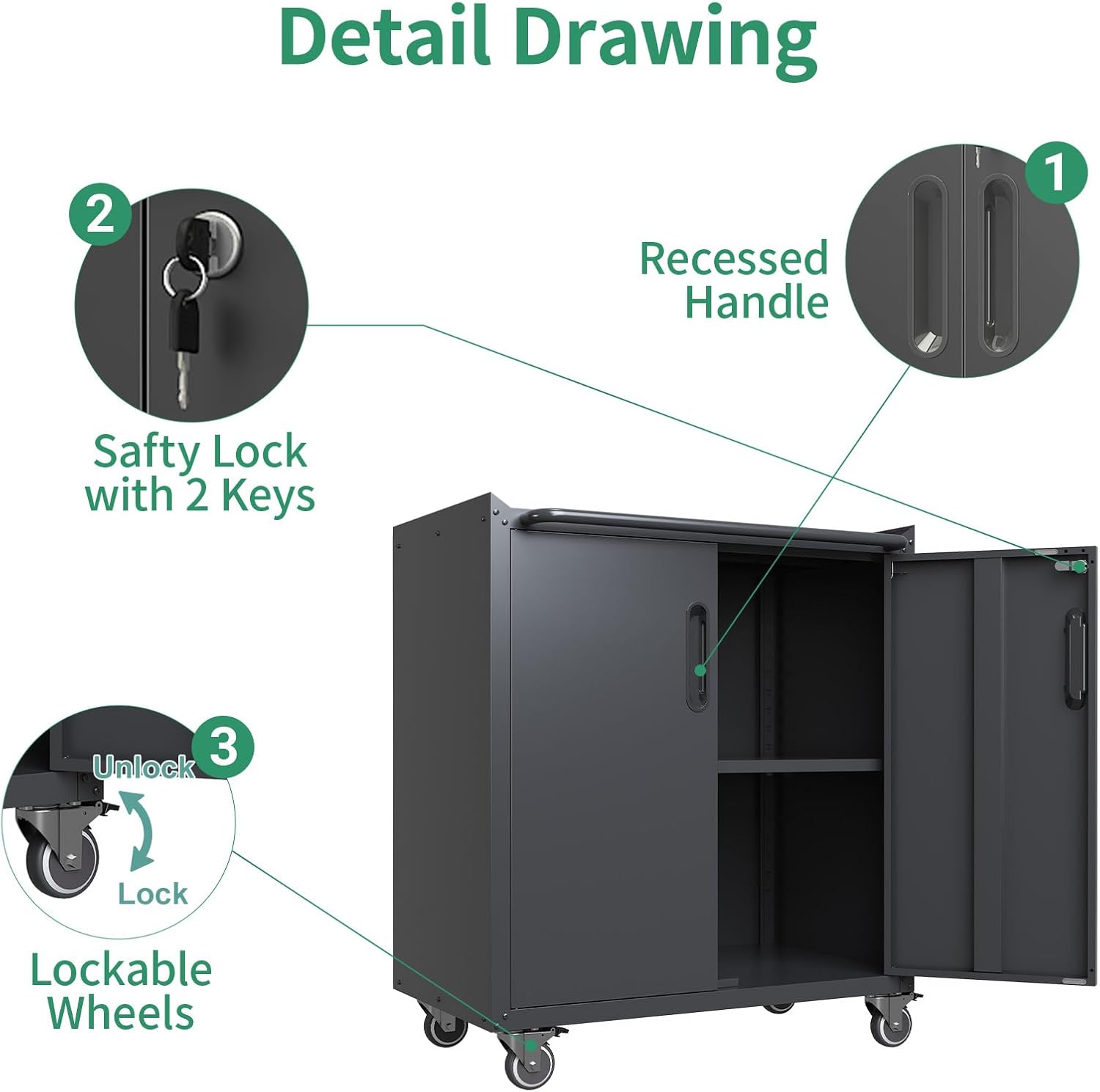 - Adjustable Shelf & Four Rotation Wheel: The shelf in this wall cabinet is adjustable and removable.You can adjust the height or remove the shelf according to your needs.The rugged steel construction can support shelves up to 130 pounds.The metal cabinet has four roting wheels, which is very convenient to move, and two fixed wheels can ensure that the cabinet is fixed when it needs to be fixed. The handle on the cabinet is convenient for you to push and pull, and you can take your cabinet to any place you want to go.