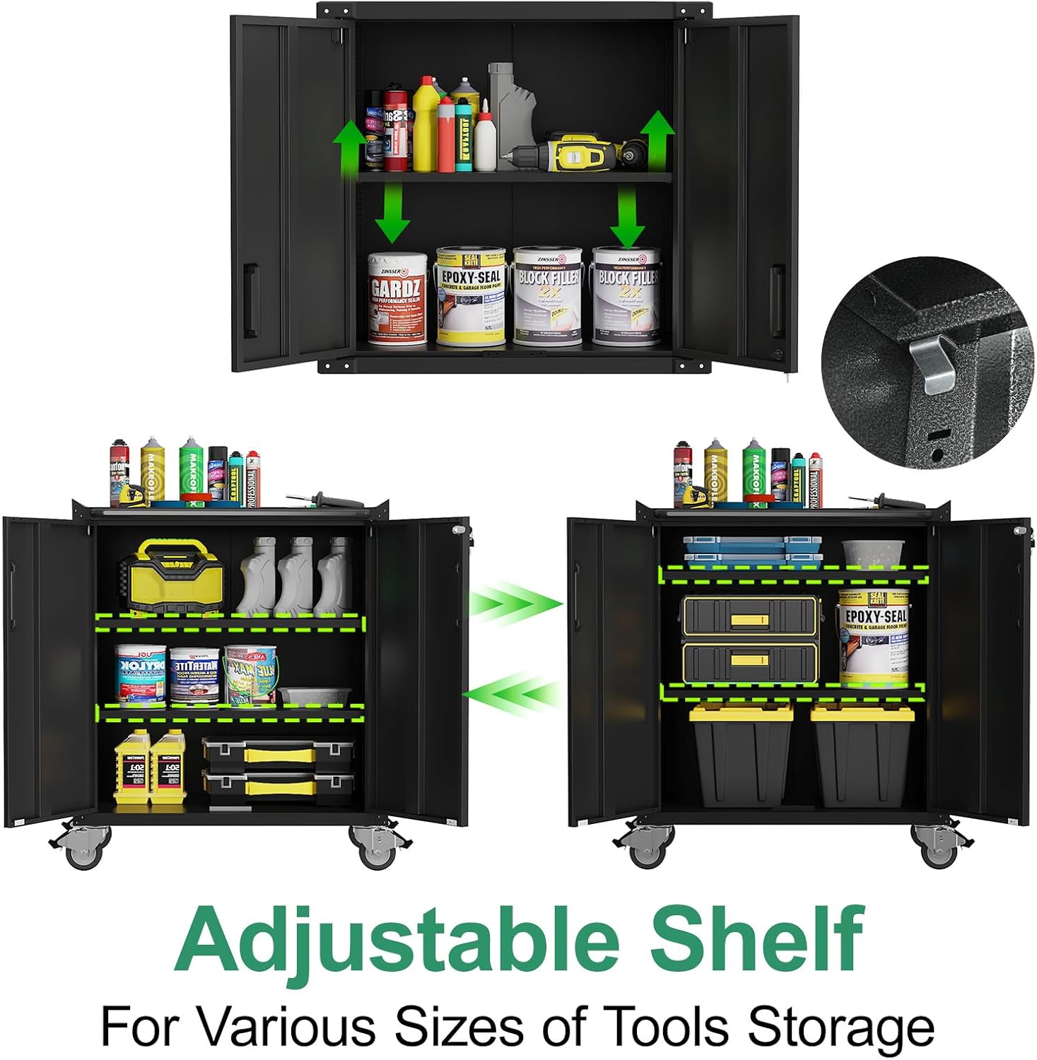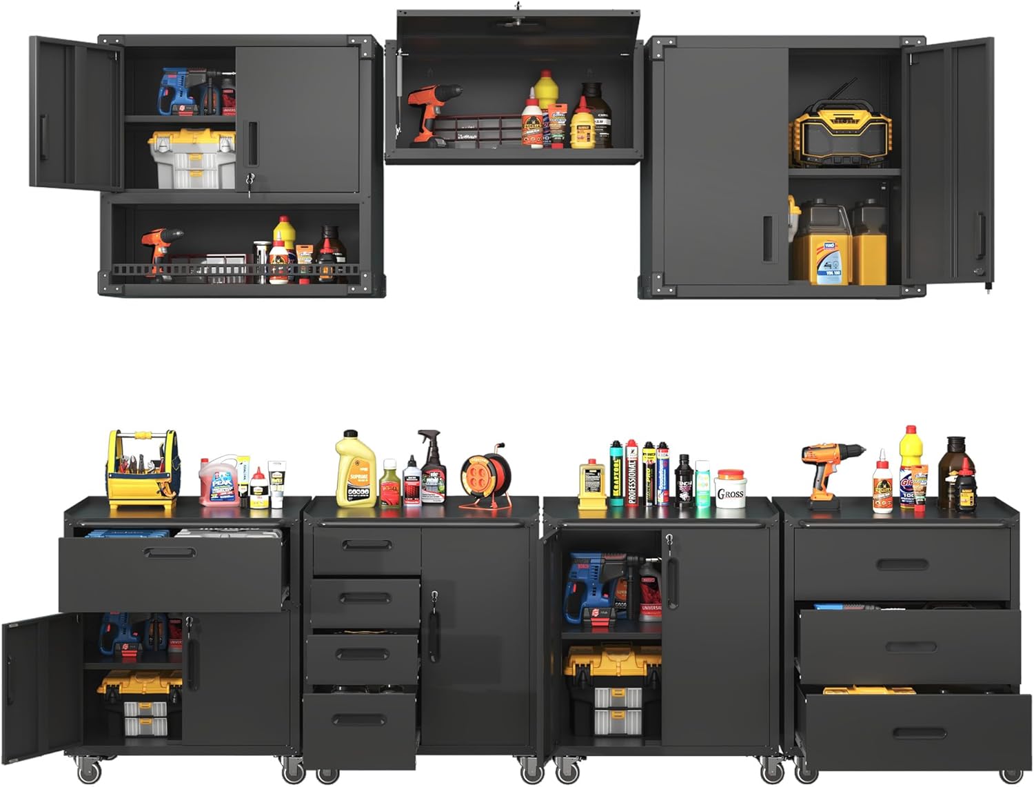 Metal Tool Cabinet,Garage Storage Cabinet System,Wall Cabinet & Locking Rolling Tool Cabinet with Doors and Adjustable Shelves,Steel Tool Cabinets for Home,Office (7 Pcs-StyleA, Black)