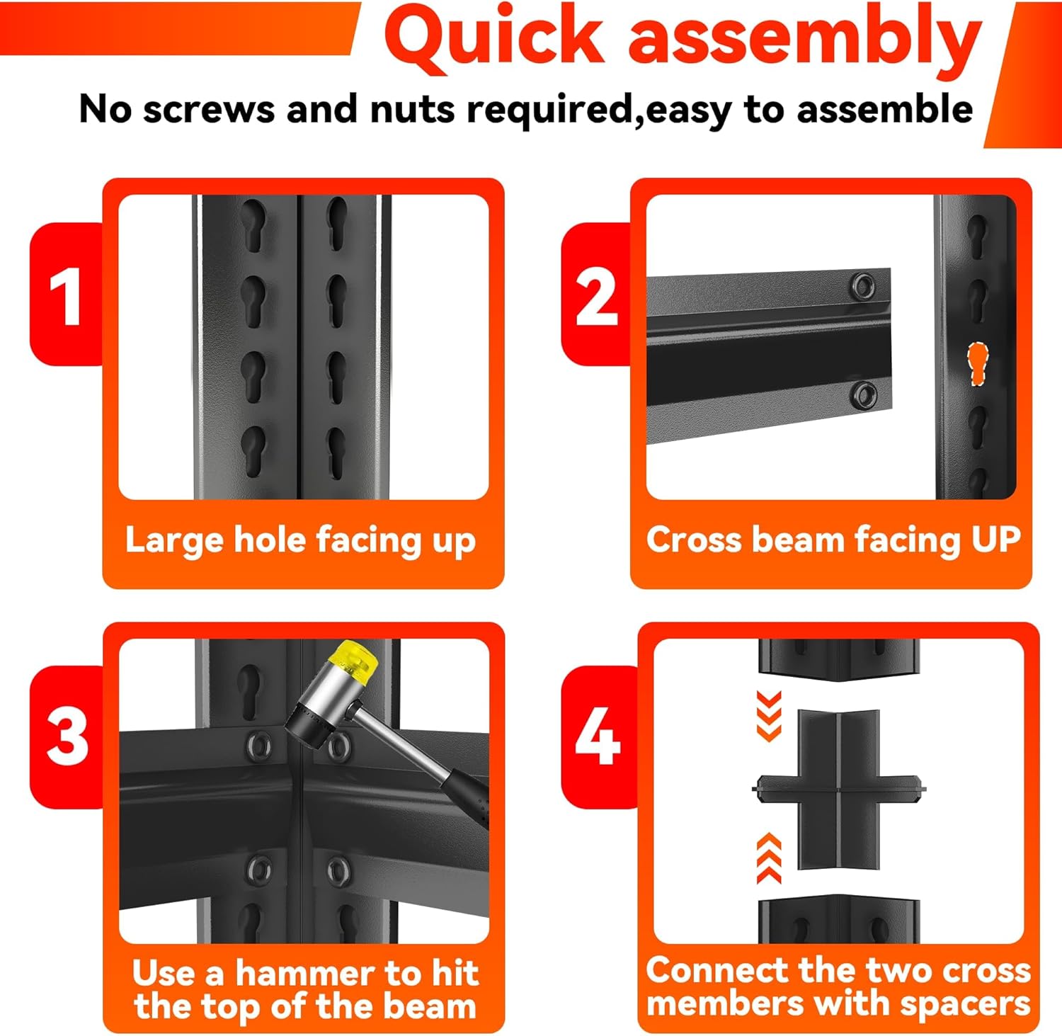 - ă10-Minute Easy Assembly & Thoughtful ServiceăNo nuts or bolts neededâeffortlessly assemble each standalone garage shelf in minutes! To simplify setup, we include a hammer and gloves. Plus, enjoy 24/7 customer support with every purchase. If any parts are damaged or missing, contact us for a swift resolution within 24 hours