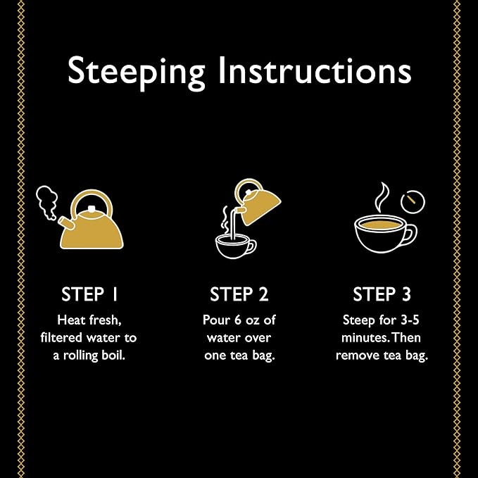 - To Steep The Perfect Cup: Heat 6 oz of fresh, filtered water to boiling. Place one tea bag in your cup, pour in the hot water and steep for 3-5 minutes.