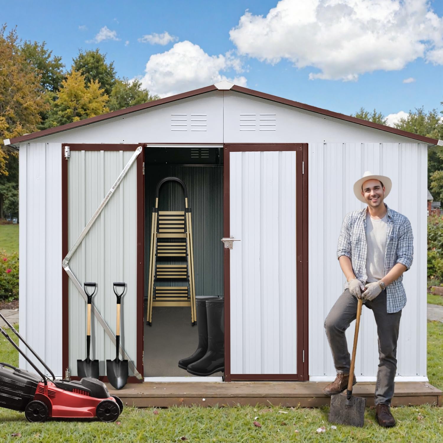 10 x 8 FT Outdoor Storage Metal Shed, Bike Garden Tool Shed with Slooping Roof, Lockable Doors and Aluminum Frames, Shed Easy to Assemble for Garden, Patio, Lawn, White