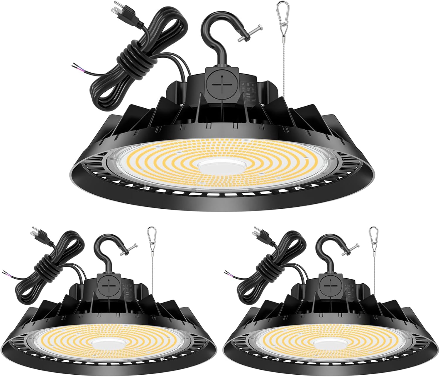 3Pack LED High Bay Lights, 300W UFO High Bay LED Shop Lights, 45000LM Adjustable CCT(5700K 5000K 4500K) & Power(300W 240W 200W), 0-10V Dimmable, 5' Cable Plug, IP65 Waterproof, ETL & DLC Listed