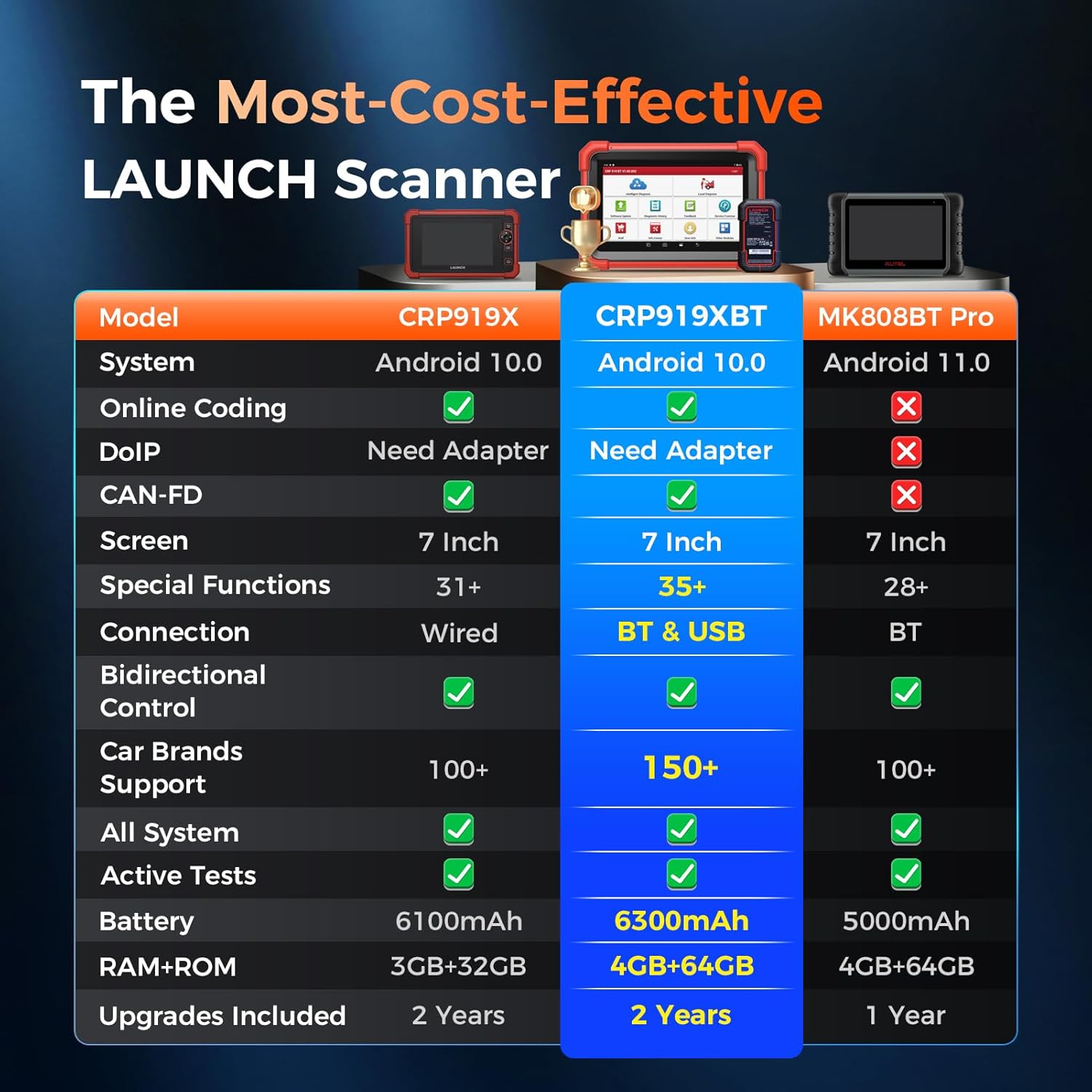- [Why Choose CRP919X BT] Because this 2025 LAUNCH scanner leaves other scan tools in the dust. ✅ Beats Autel MK808BT Pro / MK808S on features; less costs, more features. ✅ ECU coding matches luxury LAUNCH scanners X-431 PROS V+ 5.0 / PROS Elite. ✅ Extra functions you won’t find at this level: FCA AutoAuth, CAN-FD, DoIP, and built-in V.A.G step-by-step guides. ✅ Full wireless via Blu.t00th. ✅ Android 10.1, 4 GB RAM, 64 GB storage + 6,300 mAh battery = 14+ hours of nonstop smooth work.