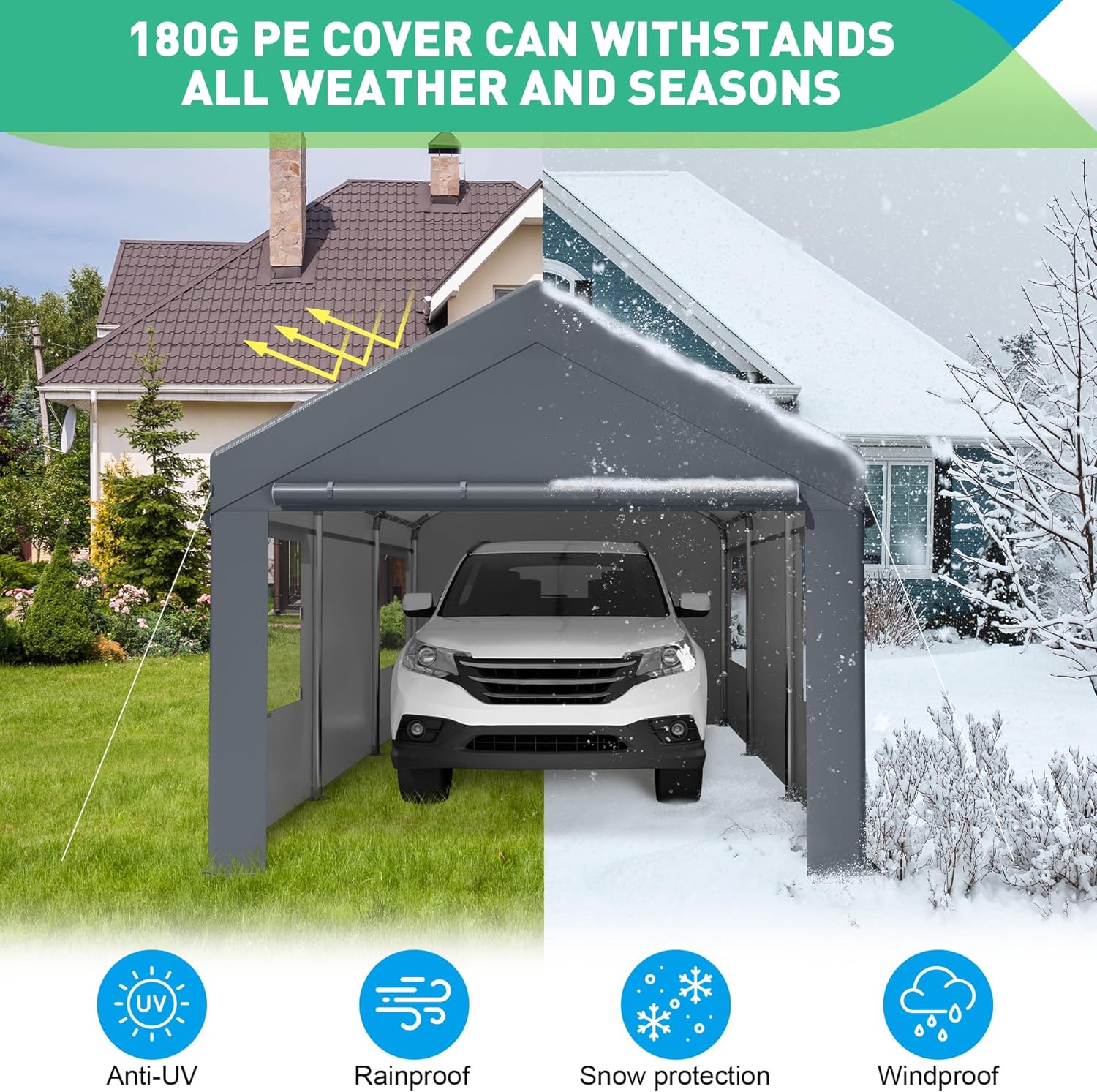 - 【ALL-SEASON PROTECTION FROM THE ELEMENTS】: Stay shielded year-round with the 180g waterproof canopy cover, crafted from extra-thick polyethylene fabric. This heavy duty all weather carport tent protects vehicles from sun, rain, dust, hail, and snow, preserving their condition. As a versatile 10 x 20 canopy tent, it delivers reliable defense against the elements, ensuring your car, boat, or bike remains safeguarded.