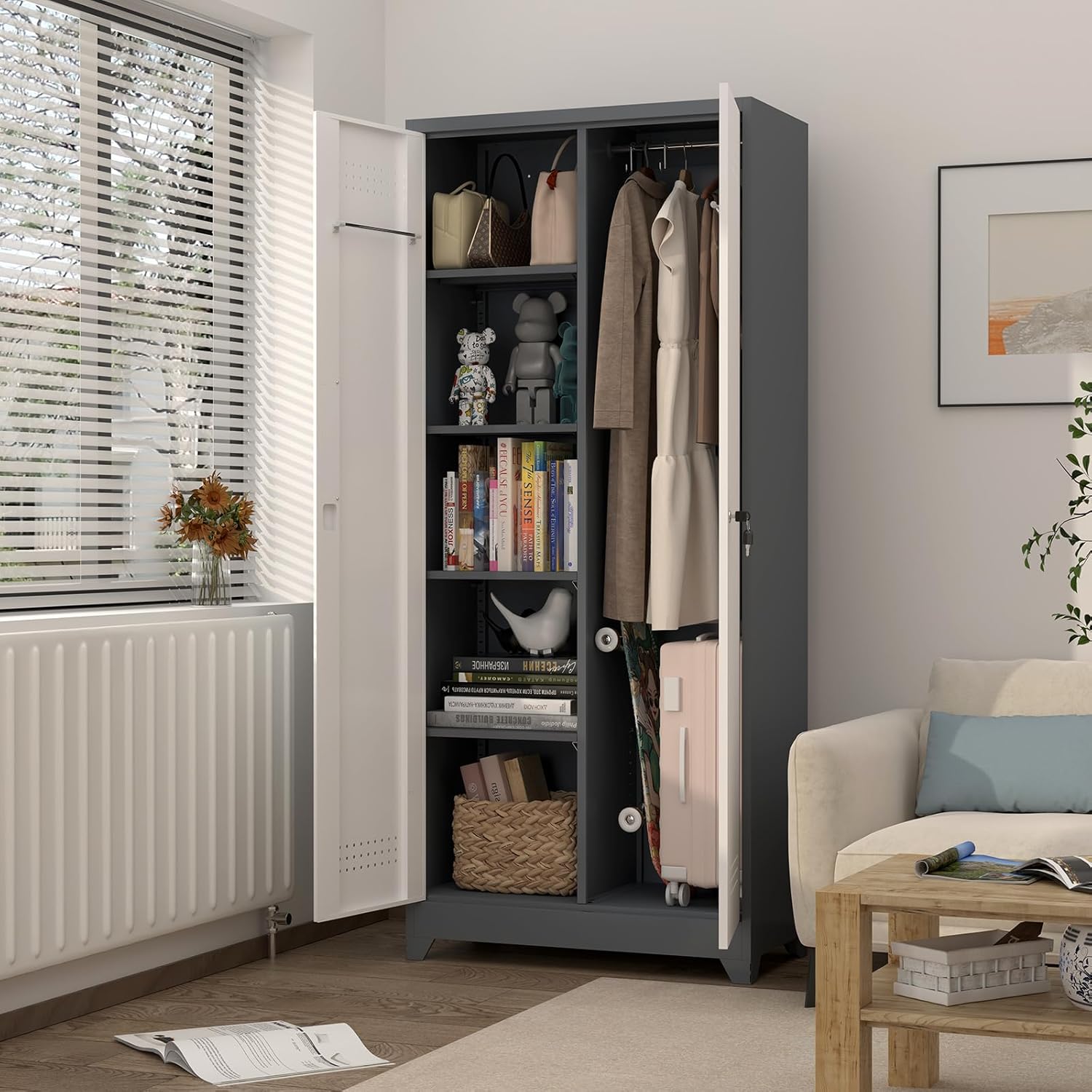 GREATMEET 72.8" H Metal Garage Storage Cabinets with Lock Door and Adjustable Shelves,Grey&White Broom Closet Storage Cabinet for Cleaning Supplies, Utility Closet for Garage, Bathroom,Kitchen,Home