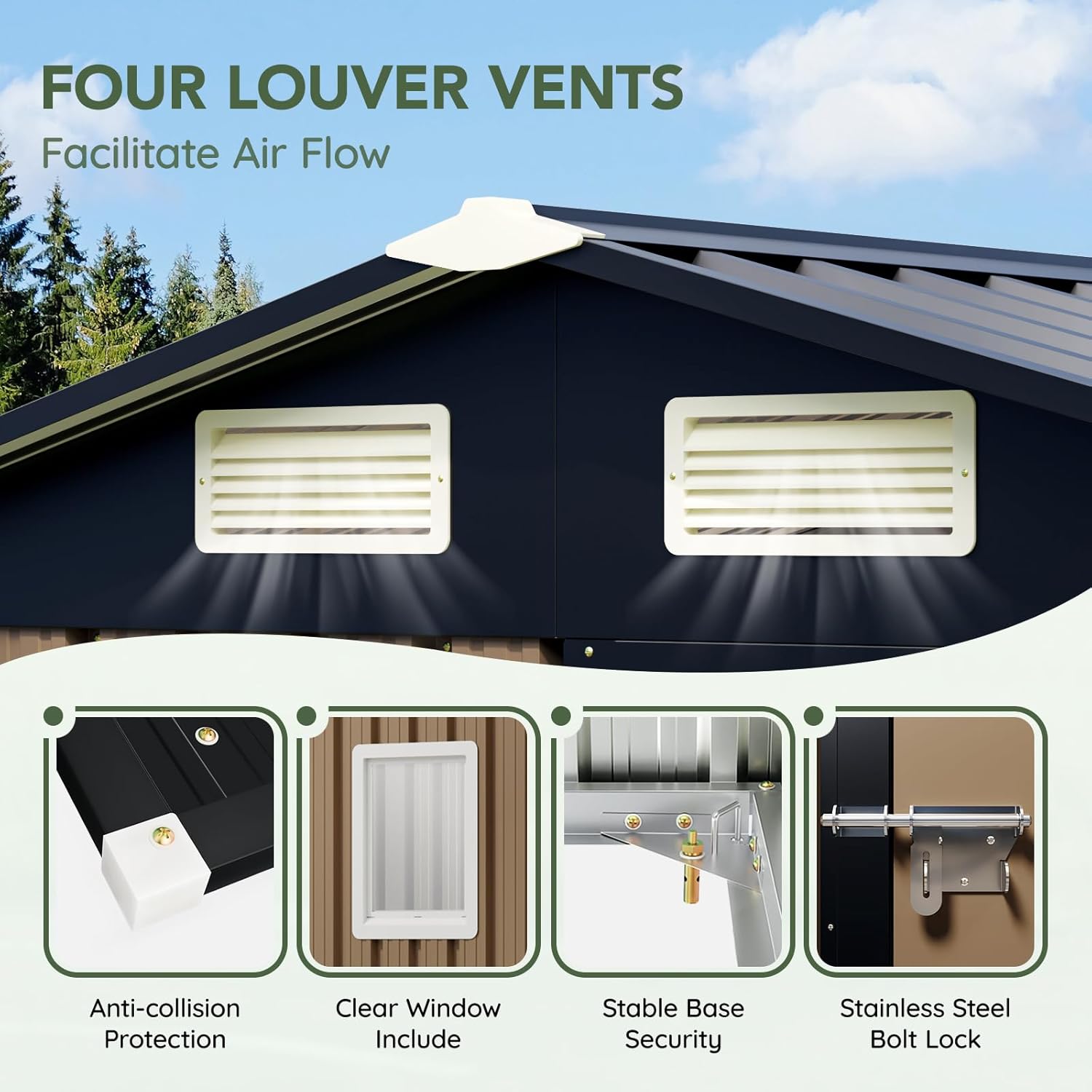 - Heavy-Duty Galvanized Steel Panels β Weather-resistant material protects against rust, corrosion, and UV damage, ensuring long-term use.