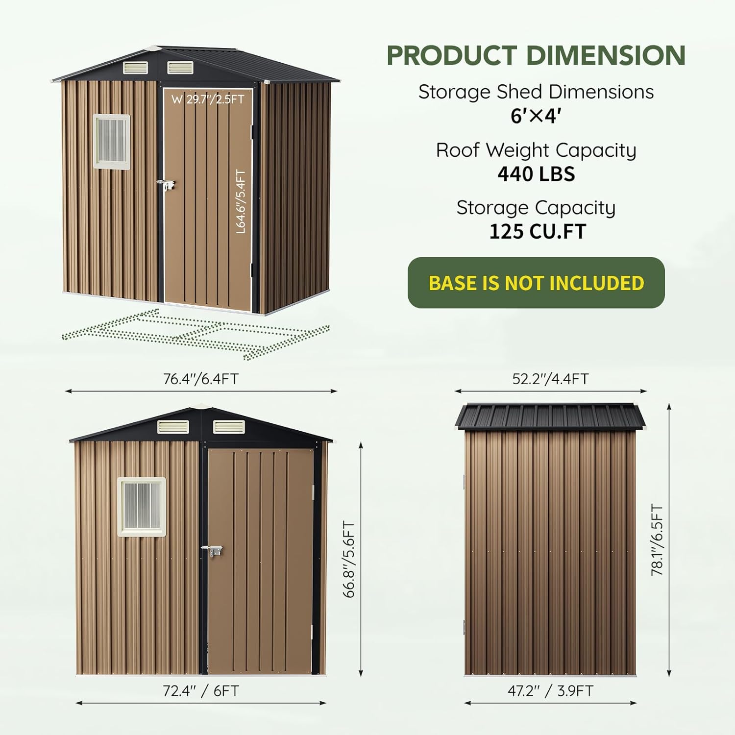6x4 FT Outdoor Metal Storage Shed, Single Door, 1 Clear Window, Tool Shed for Garden, Patio, Backyard Brown