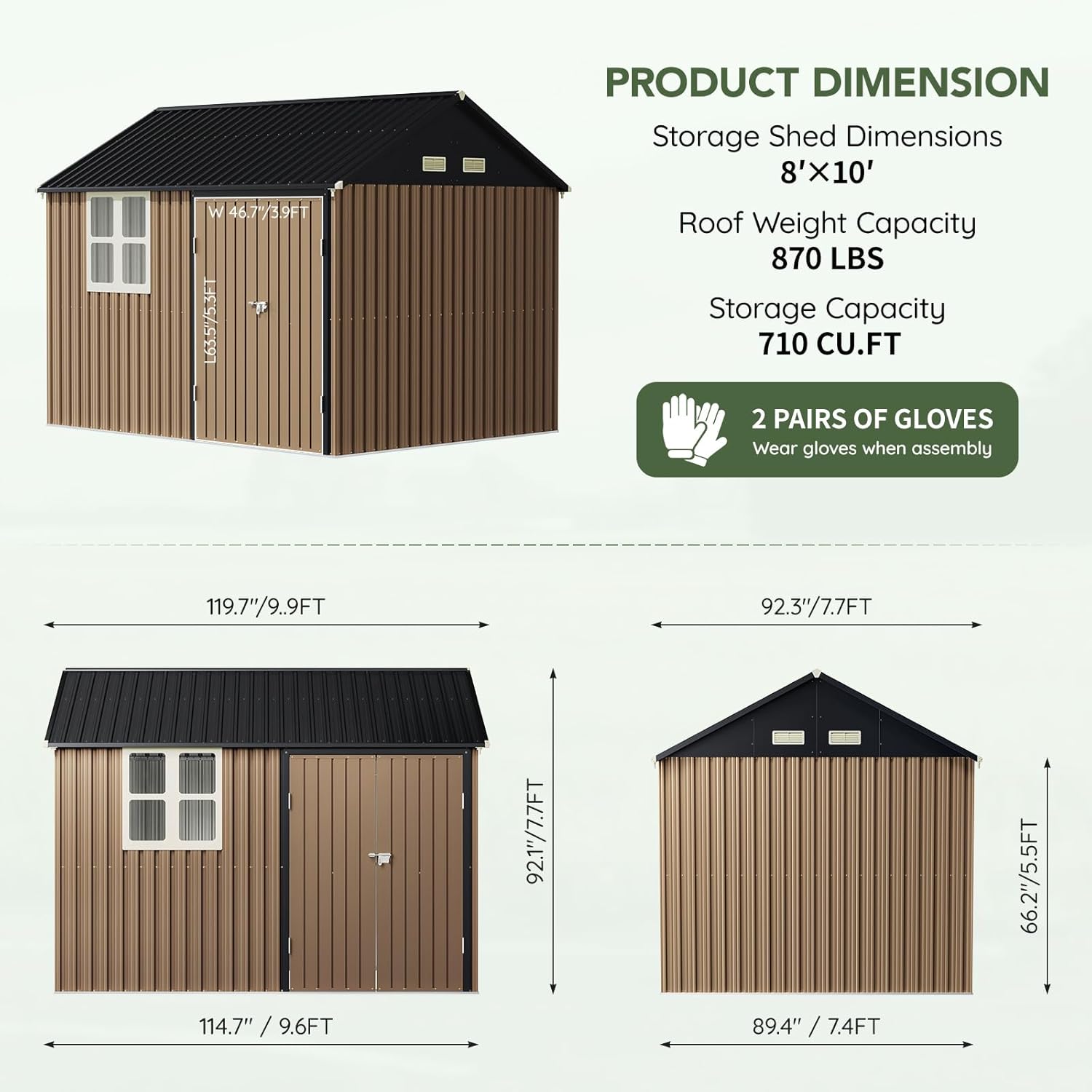 8x10 FT Outdoor Metal Storage Shed, Single Door, 1 Clear Window, Tool Shed for Garden, Patio, Backyard Brown