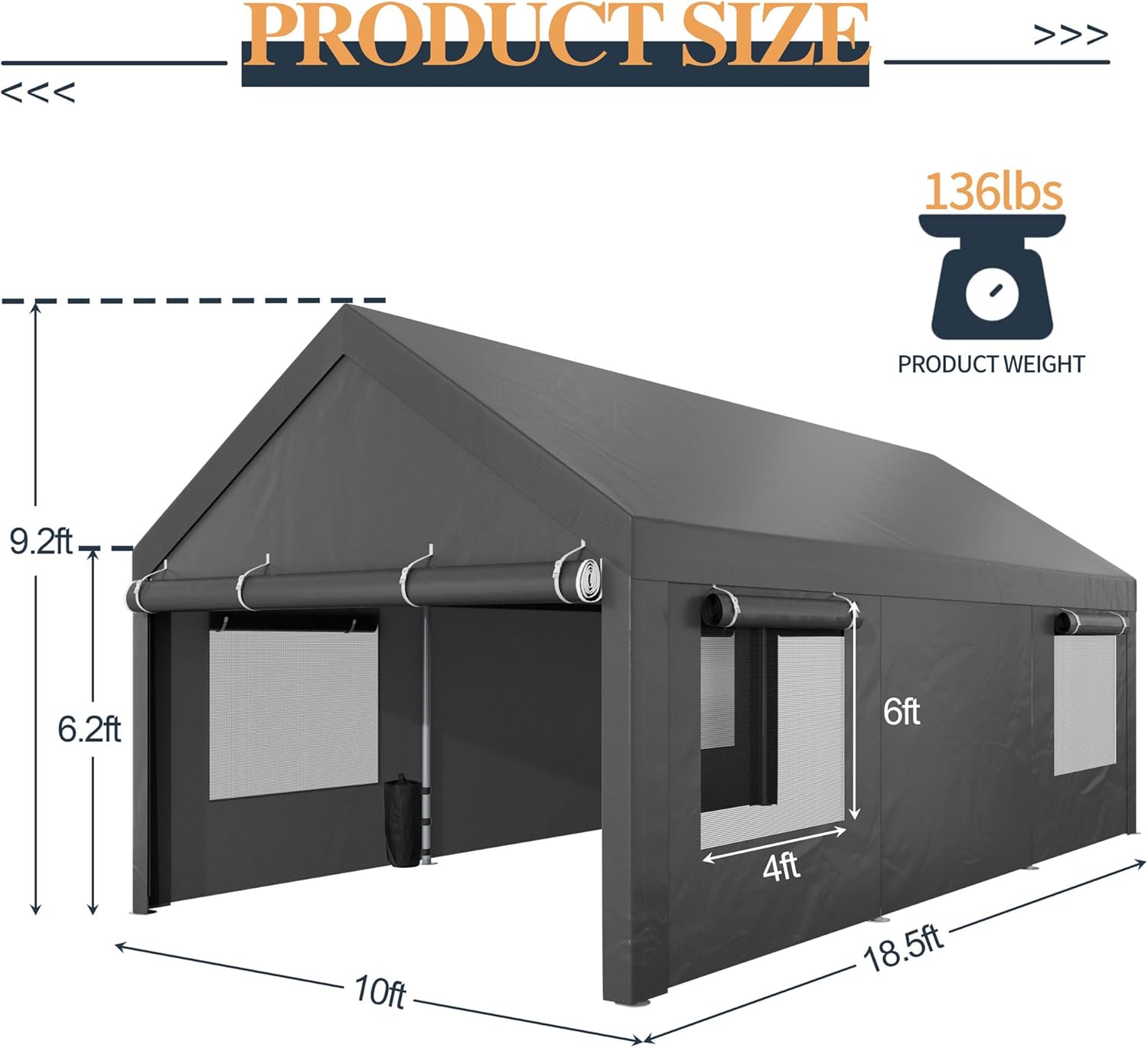 - 【Removable Side Walls & Ventilation Windows】: The roof of our carport is designed with 4 ventilation Windows on the side walls for optimal airflow throughout the year. The outer curtain can be rolled up or lowered according to the season and climate. At the same time, the four walls of the carport can be removed according to demand, which better creates space for the needs other than parking.