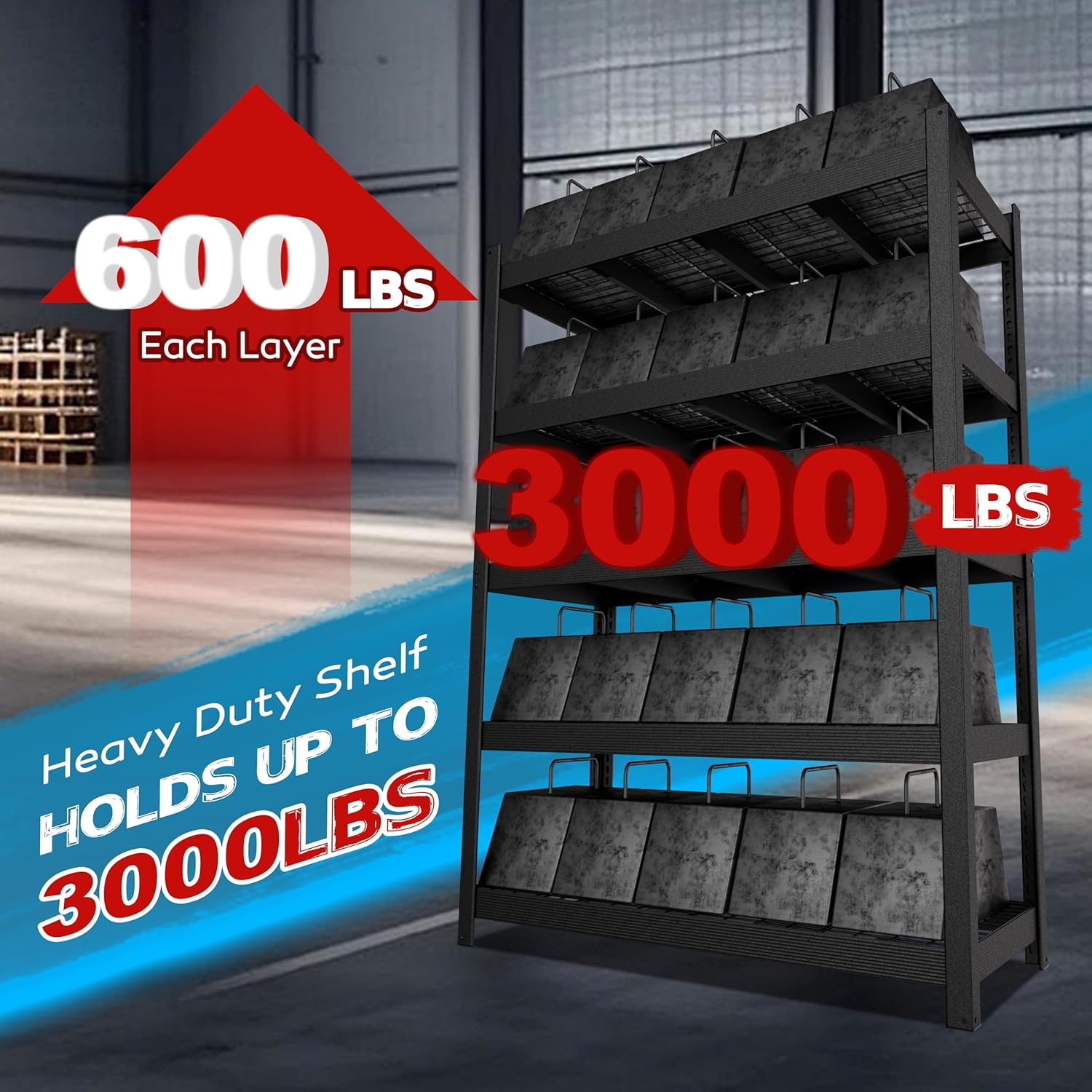 - STURDY AND HEAVY DUTY - 1 pack Garage shelving assembled dimension: 60.04”W × 24.02”D × 80.71”H, Max Load Per Shelf:600lbs, 5 tier shelves' total max load weight is 3000 lbs. Sturdy metal frame enhanced load-bearing capacity. No wobbling or shaking when fully loaded as this metal shelving has extra support beams which can enhance the stability and durability of the storage shelves.