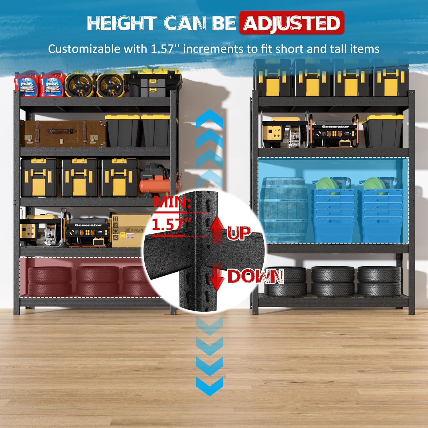 - ADJUSTABLE SHELVES - These garage storage shelves are made of high-quality thickened mesh board and metal steel frame with black powder coating. It is customizable with 1.57" increments to fit short and tall items.
