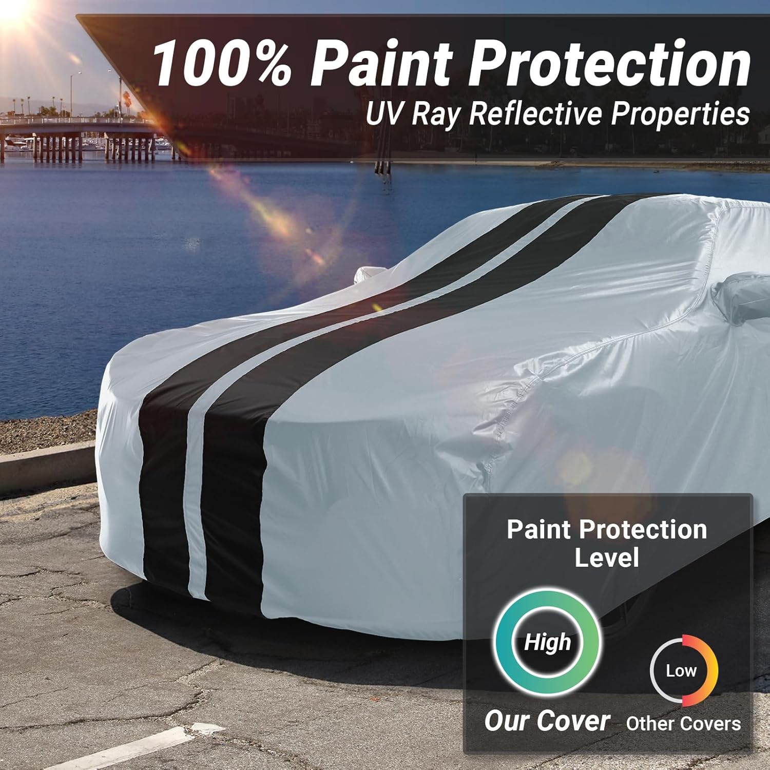 - 100% WATERPROOF & WEATHERPROOF: Designed to effectively repel water, this car cover ensures your vehicle remains dry and shielded from rain, snow, hail, and moisture. In addition, it offers weatherproof protection against harmful UV rays, dust, and dirt, keeping your car safe from the damaging effects of various environmental factors. Whether facing stormy conditions or bright sunshine, this cover provides reliable protection to preserve your vehicle’s appearance.