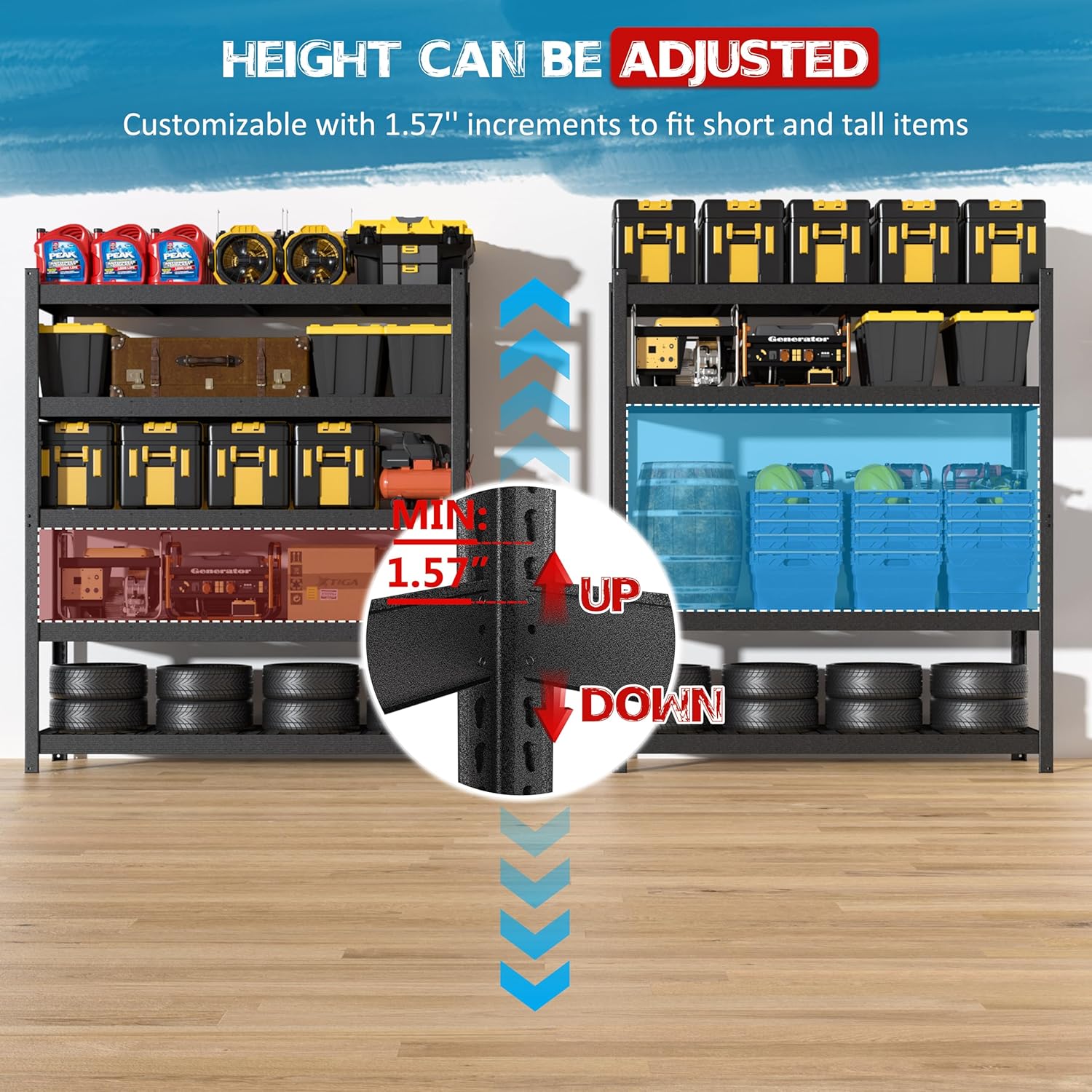 - Adjustable Storage Shelves – Featuring a rivet-design post system, you can set the shelf height in precise 1.57" increments to accommodate items of varying sizes. This shelving unit is perfect for organizing everything from small items to taller tools, providing flexible storage solutions.
